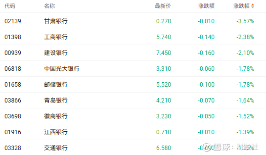 截至收盘,甘肃银行(02139.HK)、工商银行(01398.HK)、建设银行(00939.HK)分别下跌3.52%、2.38%、2.10%。