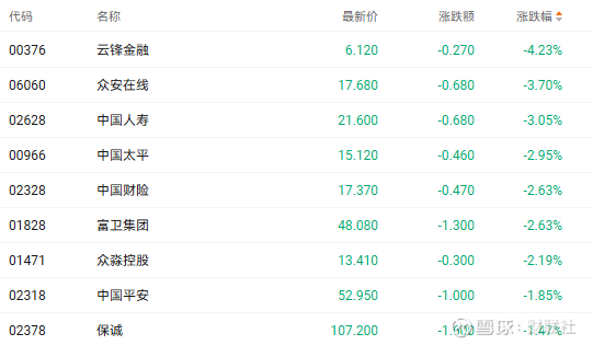 同期的保险股也走弱。截至收盘,众安在线(06060.HK)、中国人寿(02628.HK)、中国财险(02328.HK)分别下跌3.70%、3.05%、2.63%。