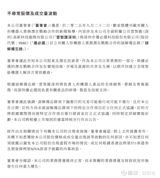9月22日,云智汇科技公告披露,其全资附属公司云智汇(深圳)科技有限公司已与优必选订立有关人形机器人业务潜在战略合作的谅解备忘录。