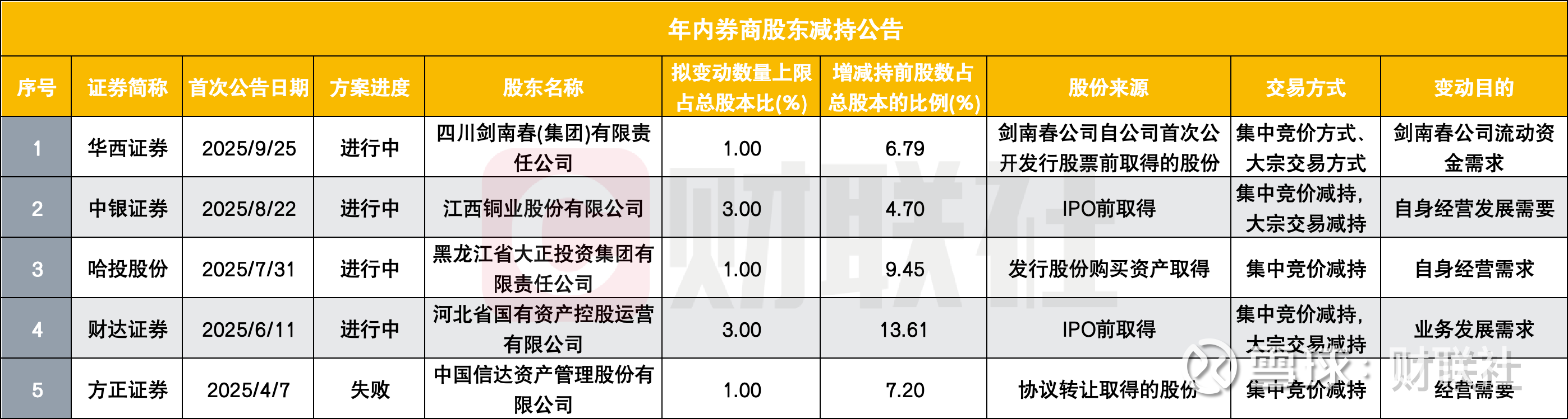 据统计,2025年以来,A股市场已有5家券商首次披露股东减持计划,除华西证券外,还包括财达证券、中银证券、哈投股份以及方正证券。