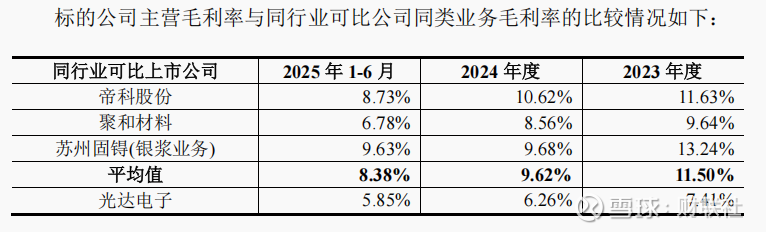 毛利率方面,标的公司低于同行业可比公司,前述报告期内分别为7.41%、6.26%、5.85%;光达电子还对其未来毛利率做出了预测,预计2026年-2030年整体毛利率维持在7.19%-7.70%区间。