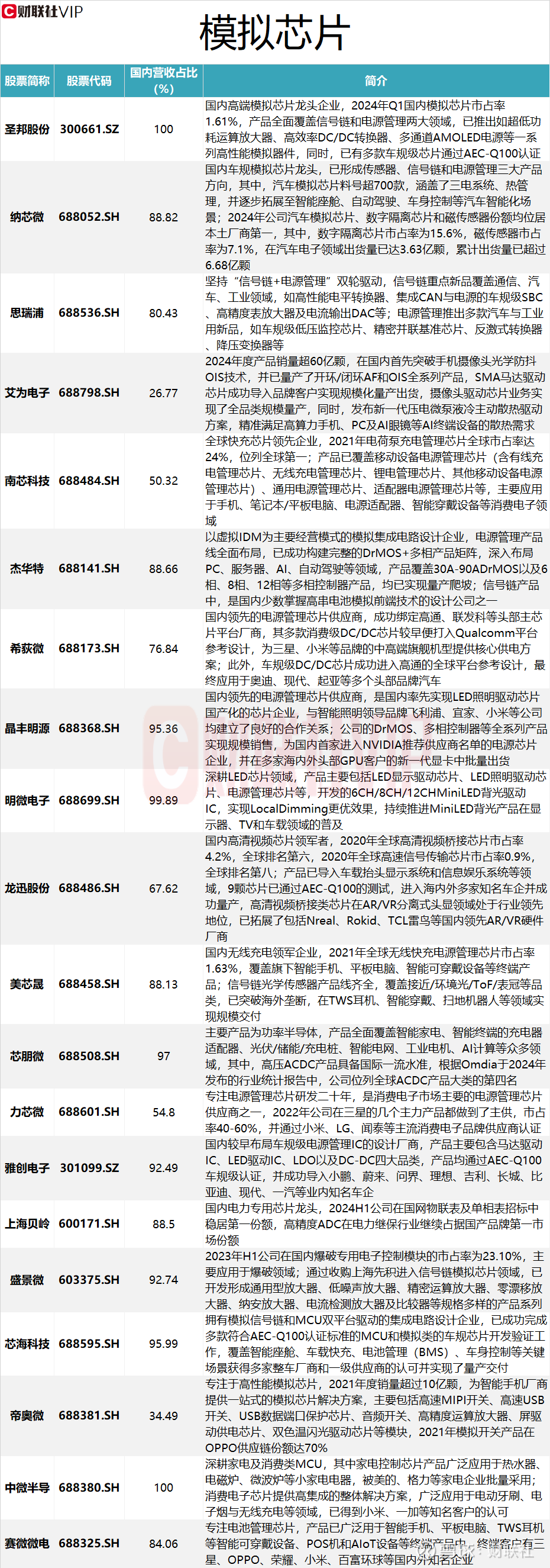 据财联社VIP数据不完全统计,模拟芯片产业链中,国内营收占比超90%的A股上市公司包括:圣邦股份、晶丰明源、明微电子、芯朋微、雅创电子、盛景微、芯海科技、中微半导。具体情况见下图: