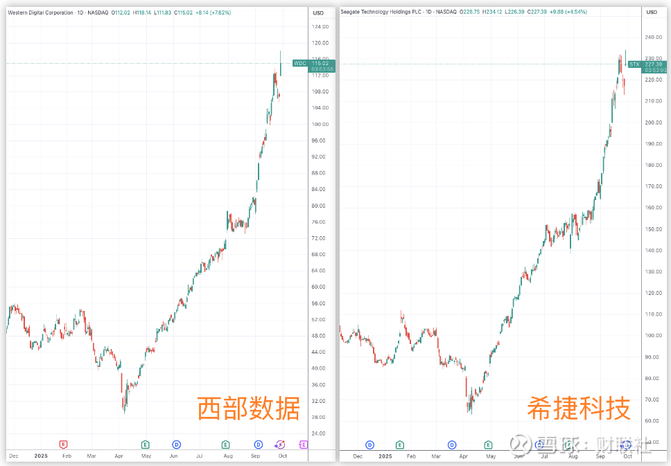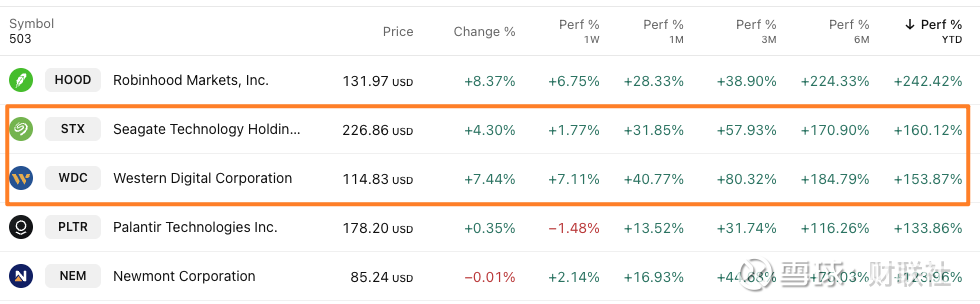 作为鲜少受到股民关注的硬件股,希捷科技年内涨幅已经达到160%、西部数据也达到153%,在标普500指数成分股的2025年涨幅榜中位列第二和第三。排名第一的是上周才进入该基准指数的互联网券商Robinhood。