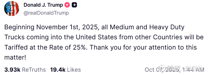 据央视新闻,当地时间10月6日,美国总统特朗普在其社交平台“真实社交”上发文表示,自2025年11月1日起,所有从其他国家和地区进口至美国的中型和重型卡车将被征收25%的关税。