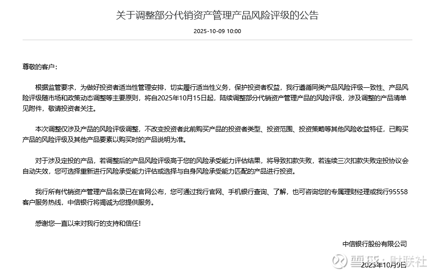 财联社10月10日讯(记者 彭科峰)10月9日,中信银行在官网发文称,将自2025年10月15日起,陆续调整部分(共计17款)代销资产管理产品的风险评级。