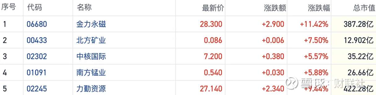 截至发稿,金力永磁(06680.HK)大涨逾11%,北方矿业(00433.HK)涨超7%。此外,力勤资源(02245.HK)、南方锰业(01091.HK)等小金属概念也明显跟涨。