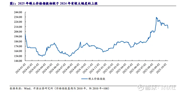且值得关注的是,今年以来稀土价格开始高位运行,表明下游需求强劲。开源证券跟踪研究显示,在稀土行业管制不断升级和供需改善的驱动下,2025年国内稀土价格指数相较于2024年有了较大幅度的提升。