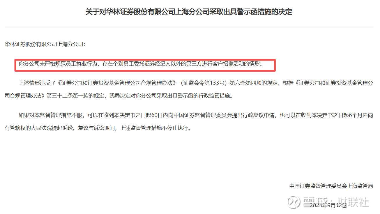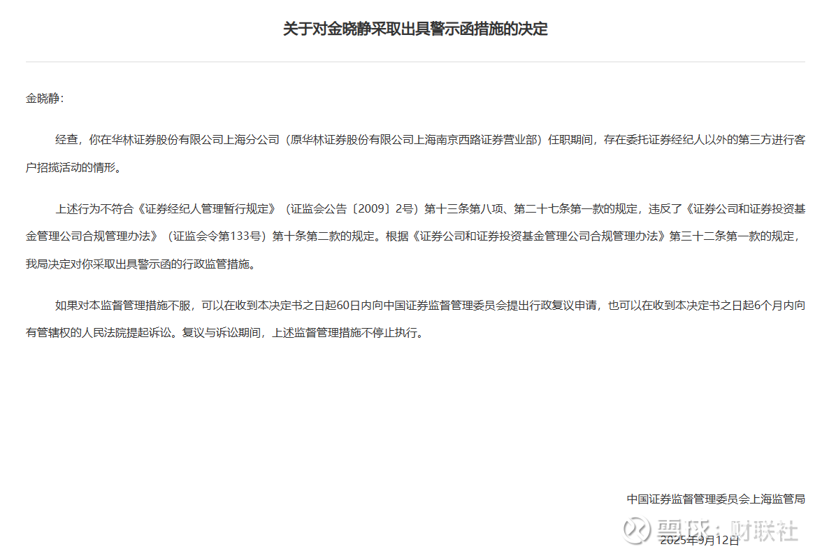 10月13日,上海证监局披露2张罚单,华林证券上海分公司及金晓静均被采取出具警示函措施。