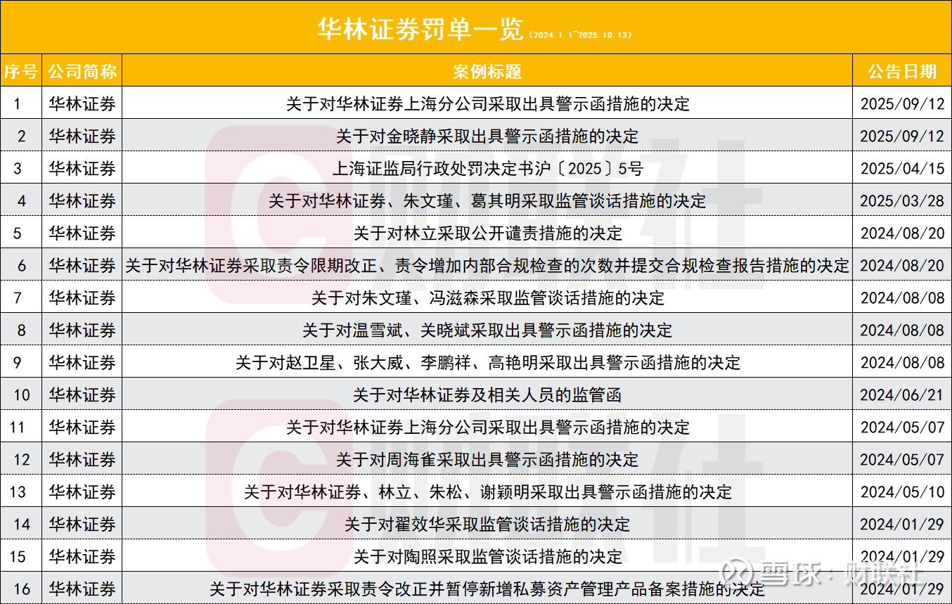 作为此次被罚主体之一,华林证券近年来多次被罚,数据显示,自去年至今该公司累计收到16张罚单,其中今年内4张。