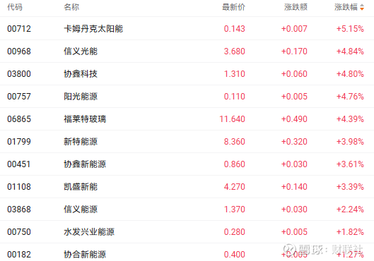 财联社10月14日讯(编辑 胡家荣)今日港股光伏板块集体走强,截至发稿,卡姆丹克太阳能(00712.HK)涨5.15%、信义光能(00968.HK)涨4.84%、协鑫科技(03800.HK)涨4.80%、阳光能源(00757.HK)涨4.76%、福莱特玻璃(06865.HK)涨4.39%。