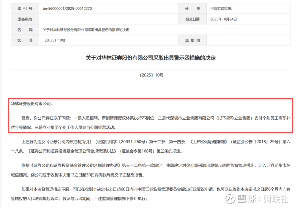 西藏证监局披露对华林证券的警示函,直指三大问题:一是人员招聘、薪酬管理授权体系执行不到位;二是代深圳市立业集团有限公司(以下简称立业集团)支付个别员工离职补偿金等情况;三是立业集团个别工作人员参与公司经营活动。