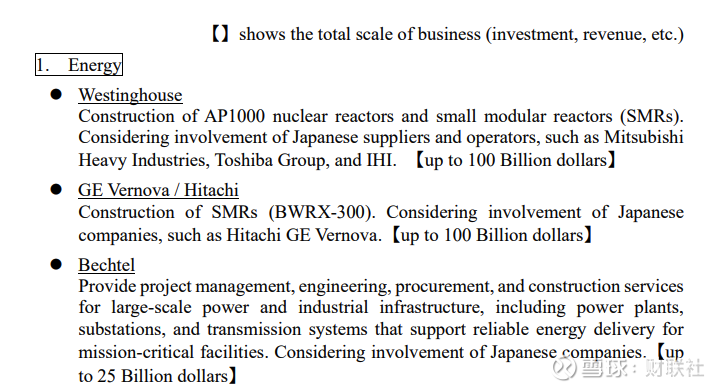 引发关注的是,日本政府的列表中包含了超过3000亿美元的能源投资项目,其中核电站占了绝对大头。在列表中的前两项,分别是西屋电气AP1000核反应堆,以及GE Vernova/日立BWRX-300小型模块化反应堆项目,项目金额均最高可达1000亿美元。