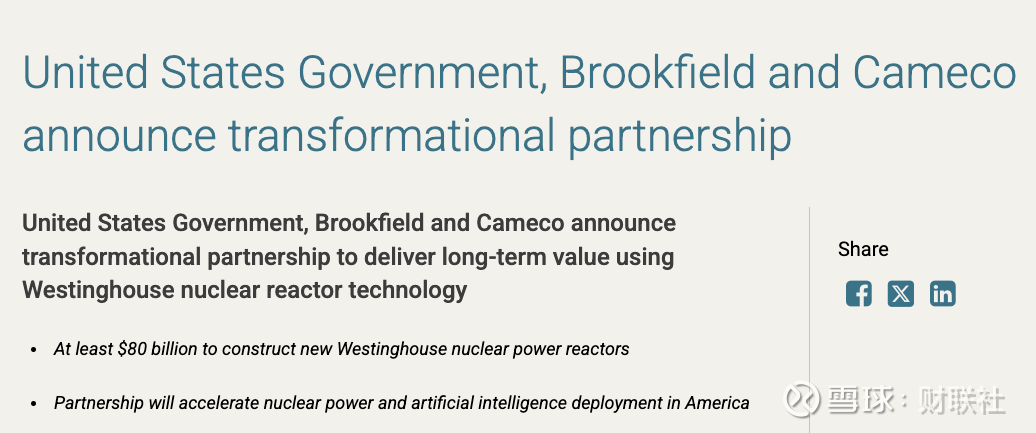 凑巧的是,上市公司Cameco、Brookfield资管在周二盘前披露,与美国政府签署了一项战略伙伴关系协议,将在美国各地建设“至少800亿美元”的西屋电气AP1000核电机组,构成美国核能与AI产业的关键支柱。