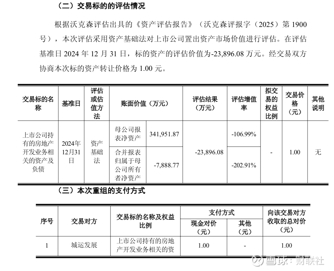 在评估基准日2024年12月31日,标的资产的评估价值约-2.39亿元。经交易双方协商,本次标的资产转让价格为1元。