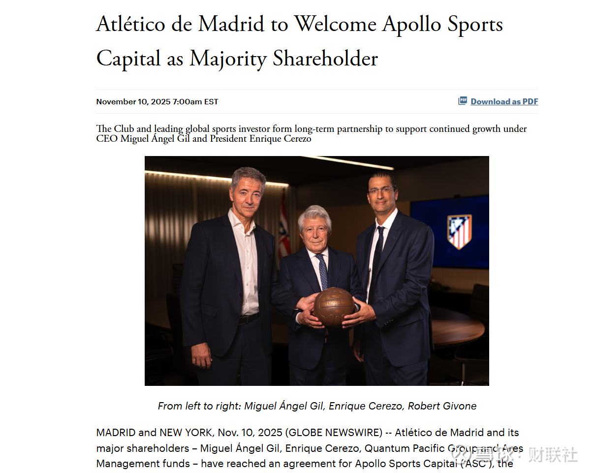 财联社11月10日讯(编辑 史正丞)美股上市公司、华尔街私募巨头阿波罗全球管理公司(Apollo Global Management)周一发布公告称,与西班牙足球豪门马德里竞技的现有股东达成协议,华尔街资管将成为西甲豪门的大股东。
