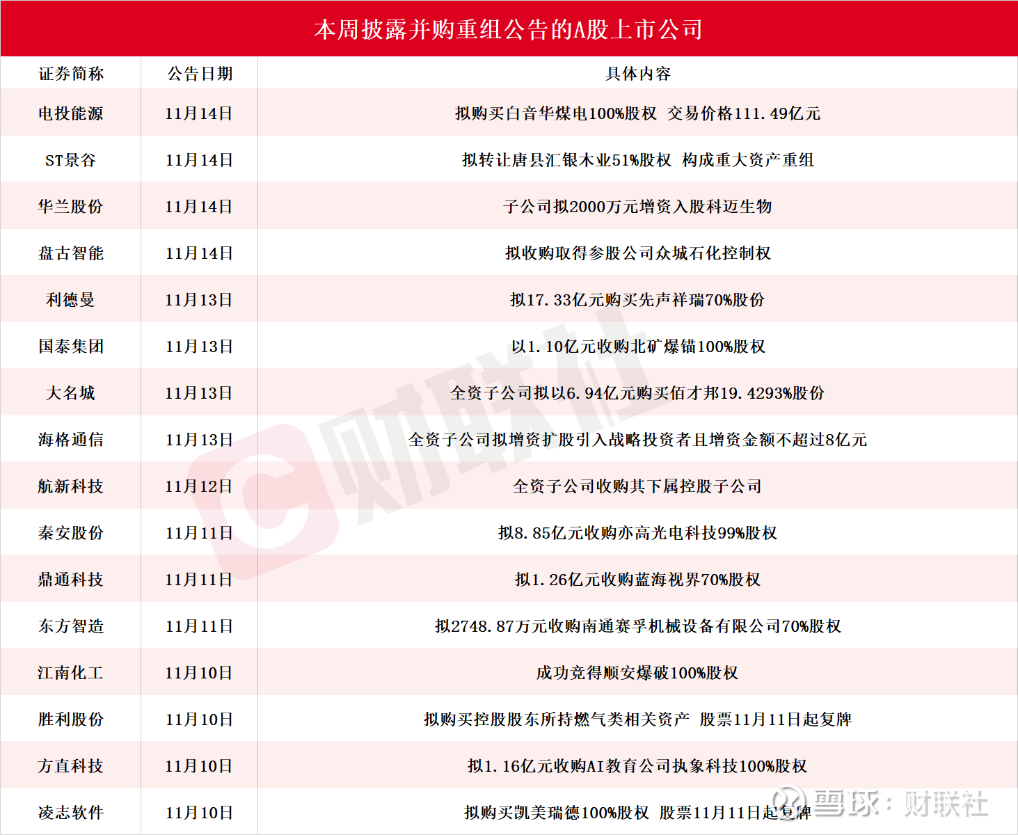 据财联社不完全统计,截至发稿,本周披露并购重组进展的A股上市公司共有16家,包括电投能源、ST景谷、华兰股份、盘古智能、利德曼、国泰集团、大名城、海格通信、航新科技、秦安股份、鼎通科技、东方智造、江南化工、胜利股份、方直科技、凌志软件。具体情况如下图: