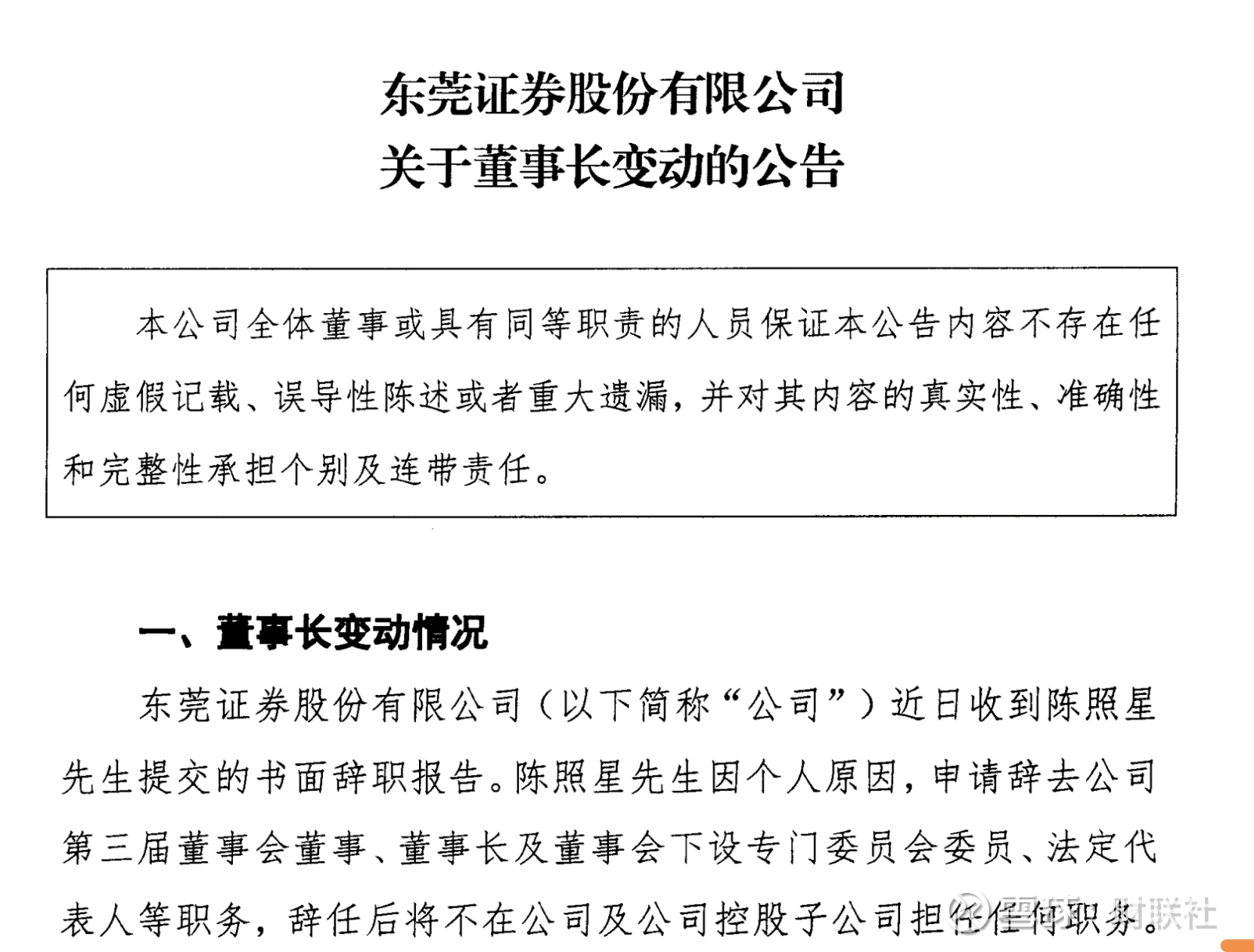 财联社11月28日讯(记者 林坚)券商年末重要人事调整再添一例,这次是东莞证券。东莞证券今日公告称,陈照星近日因个人原因辞任公司董事长职务,由潘海标出任董事长。
