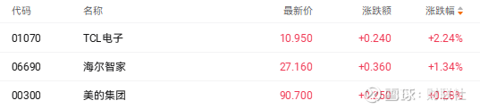 财联社12月3日讯(编辑 胡家荣)今日家电股延续涨势。截至发稿,TCL电子(01070.HK)涨2.24%、海尔智家(06690.HK)涨1.34%、美的集团(00300.HK)涨0.28%。