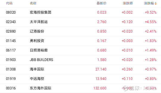 财联社12月4日讯(编辑 胡家荣)受益航运市场持续回暖,今日港股相关表现活跃。截至发稿,太平洋航运(02343.HK)涨4.55%、辽港股份(02880.HK)涨2.41%、海丰国际(01308.HK)涨0.97%、东方海外国际(00316.HK)涨0.68%。