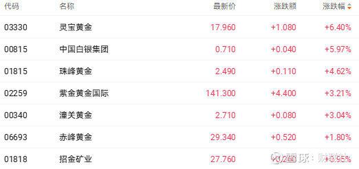 财联社12月10日讯(编辑 胡家荣)受益于市场对于贵金属股的热度持续攀升,港股相关个股多数走强。截至发稿,灵宝黄金(03330.HK)涨6.40%、中国白银集团(00815.HK)涨5.97%、珠峰黄金(01815.HK)涨4.62%、紫金黄金集团(02259.HK)涨3.21%、赤峰黄金(06693.HK)涨1.80%。