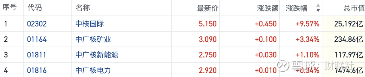 截至发稿,今日中核国际(02302.HK)涨超9%,中广核矿业(01164.HK)等个股也纷纷跟涨。