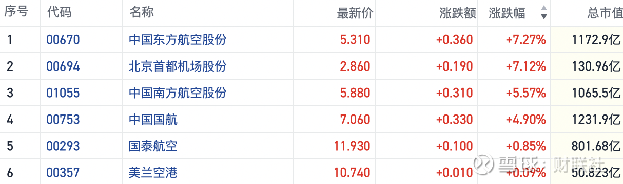 截至发稿,北京首都机场股份(00694.HK)、中国东方航空股份(00670.HK)均涨超7%,中国国航(00753.HK)、中国南方航空股份(01055.HK)也都大幅跟涨约5%左右。