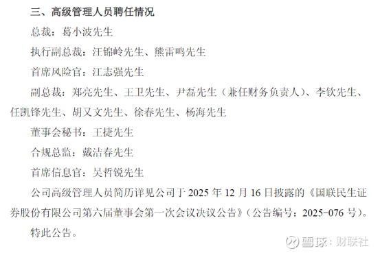 国联民生证券第六届董事会于2025年12月15日换届,顾伟当选董事长。董事会设立风险控制委员会、审计委员会等四个专门委员会,顾伟兼任风险控制委员会和战略与ESG委员会主任委员,郭春明、高伟分别担任审计委员会、薪酬及提名委员会主任委员。公司聘任葛小波为总裁,王捷为董事会秘书,江志强为首席风险官,戴洁春为合规总监,汪锦岭、熊雷鸣任执行副总裁,郑亮等8人任副总裁,吴哲锐任首席信息官,尹磊兼任财务负责人,陈正章担任证券事务代表。