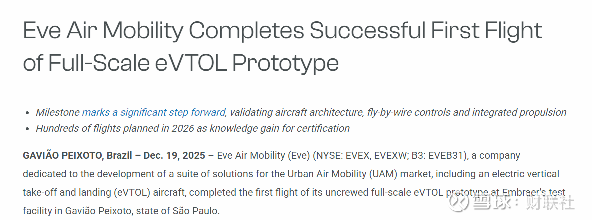 Eve表示,此次测试验证了飞行器架构、电传飞控系统以及集成推进系统的性能。首飞时间符合公司此前公布的在2025年底或2026年初完成首飞的目标。