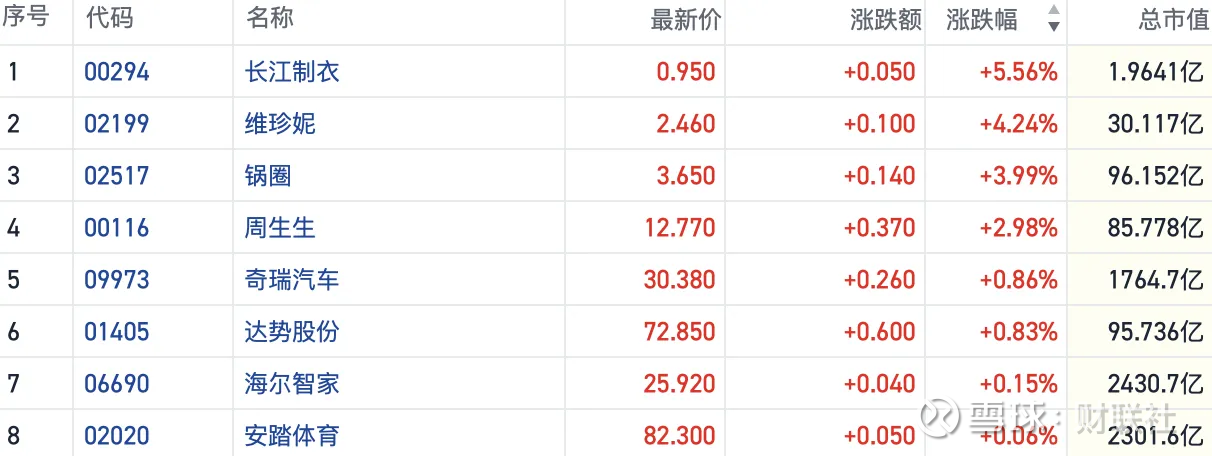 截至发稿,维珍妮(02199.HK)涨超4%,锅圈(02517.HK)、周生生(00116.HK)涨约3%。此外,海尔智家(06690.HK)、安踏体育(02020.HK)等行业龙头也纷纷飘红。