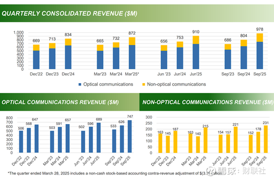 在 FY2026 财年第一季度,公司实现营收 9.78 亿美元,同比增长约 22%,主要受益于数据中心相关光通信需求回暖及部分非光通信业务持续增长。GAAP 口径下,公司实现归母净利润 0.96 亿美元,对应摊薄每股收益 2.66 美元;非 GAAP 摊薄每股收益为 2.92 美元,盈利能力持续改善。