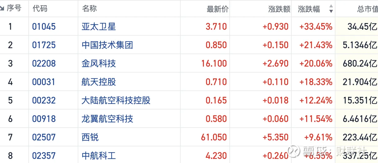 截至发稿,亚太卫星(01045.HK)大涨逾30%,金风科技(02208.HK)、中国技术集团(01725.HK)均涨逾20%,航天控股(00031.HK)等个股也大幅跟涨。