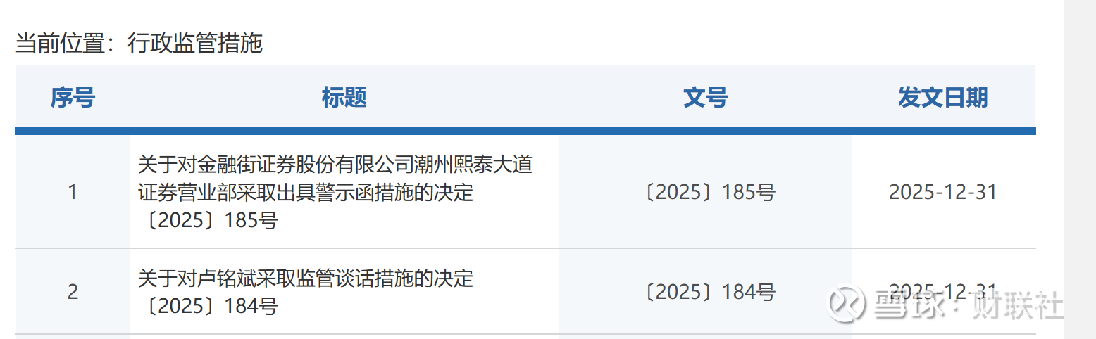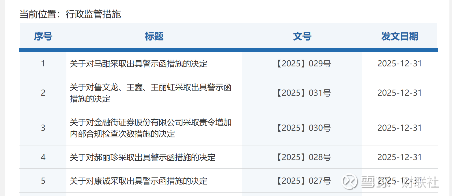 2025年12月31日,内蒙古证监局与广东证监局同步发布监管措施,合计对金融街证券开出7份罚单。其中,监管部门对金融街证券公司采取责令增加内部合规检查频次的行政监管措施;同时,针对其多家分支机构及7名涉事员工,分别出具警示函。