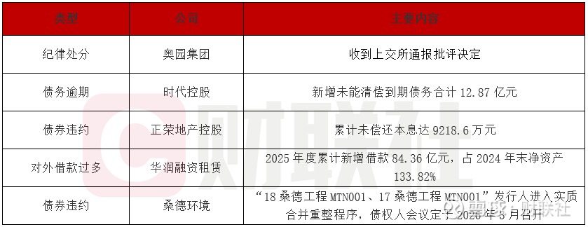 管理人浙商银行发布公告称,“18桑德工程MTN001、17桑德工程MTN001”此前发生本息违约。最新进展显示,北京市第一中级人民法院裁定对发行人及其关联公司进行实质合并重整,并定于2026年3月4日召开第一次债权人会议。发行人未能兑付本金5亿元及相应利息,主承销商将持续督导信息披露及违约处置工作。