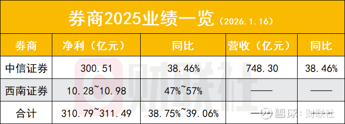 截至1月15日,中信证券、西南证券率先披露2025年业绩数据,一“大”一“小”两家代表性券商均交出超预期答卷,头部券商中信证券归母净利润高达300.51亿元,同比大增38.46%;中小券商代表西南证券归母净利润区间达10.28亿元至10.98亿元,同比增幅高达47%至57%。两家券商净利润合计同比增速区间达38.75%至39.06%。