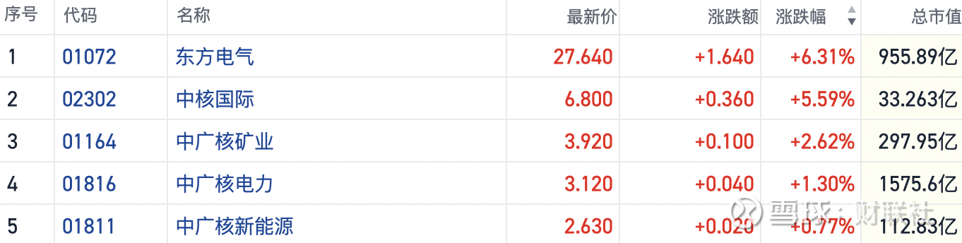 截止发稿,今日东方电气(01072.HK)涨超6%,中核国际(02302.HK)涨逾5%,中广核电力(01816.HK)等个股明显跟涨。