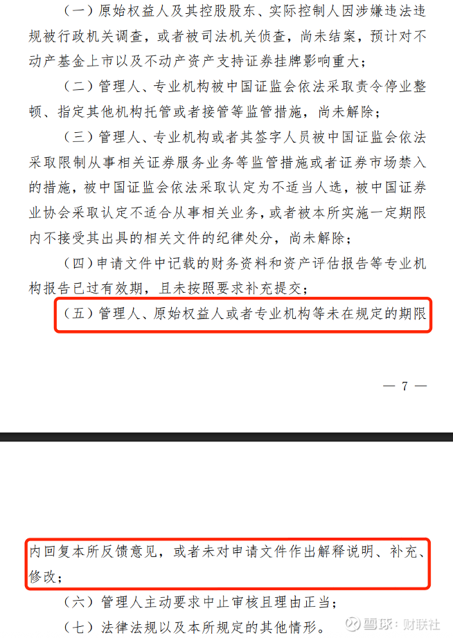 内容包含审核程序、扩募、新购入不动产等在内的一揽子业务规则,当中有条款明确公募REITs审核可以终止的若干具体情形,其中就包括申请人未在规定期限内回复交易所反馈意见、申报文件中的财务资料和资产评估报告超过有效期而未补充等。
