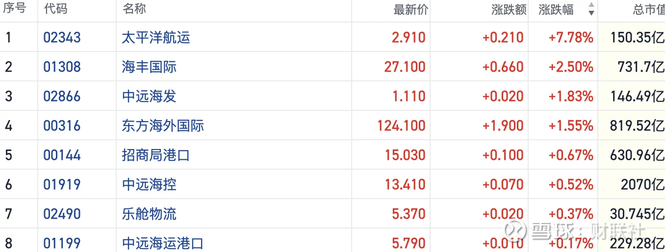 截至发稿,太平洋航运(02343.HK)涨近8%,海丰国际(01308.HK)涨逾2%,东方海外国际(00316.HK)等个股也纷纷逆市飘红。