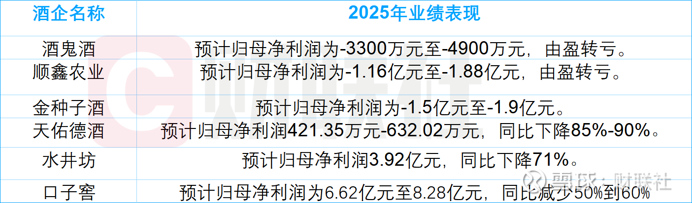 酒鬼酒的业绩颓势并非个例,在目前已发布2025年业绩预告的酒企中,天佑德酒(002646.SZ)、水井坊(600779.SH)、口子窖(603589.SH)等企业去年归母净利润同比下滑幅度最低为50%;顺鑫农业(000860.SZ)、金种子酒(600199.SH)等企业则处于亏损状态,行业寒意尽显。