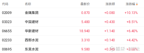 截至收盘,中国建材(03323.HK)涨8.51%、华新建材(06655.HK)涨6.40%、东吴水泥(00695.HK)涨3.68%。