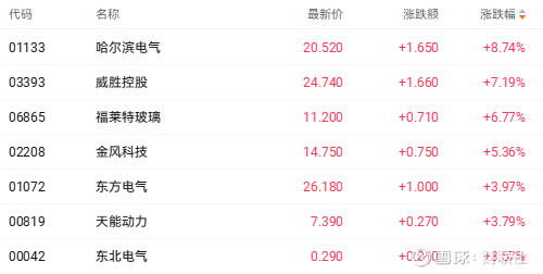 截至收盘,哈尔滨电气(01133.HK)涨8.74%、福莱特玻璃(06865.HK)涨6.77%、金风科技(02208.HK)涨5.36%。