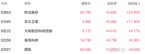 截至收盘,钧达股份(02865.HK)涨23.85%、亚太卫星(01045.HK)涨11.50%、大陆航空科技控股(00232.HK)涨6.217%。