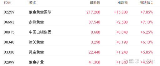 截至收盘,紫金黄金国际(02259.HK)涨7.85%、赤峰黄金(06693.HK)涨7.13%、中国白银集团(00815.HK)涨6.25%。