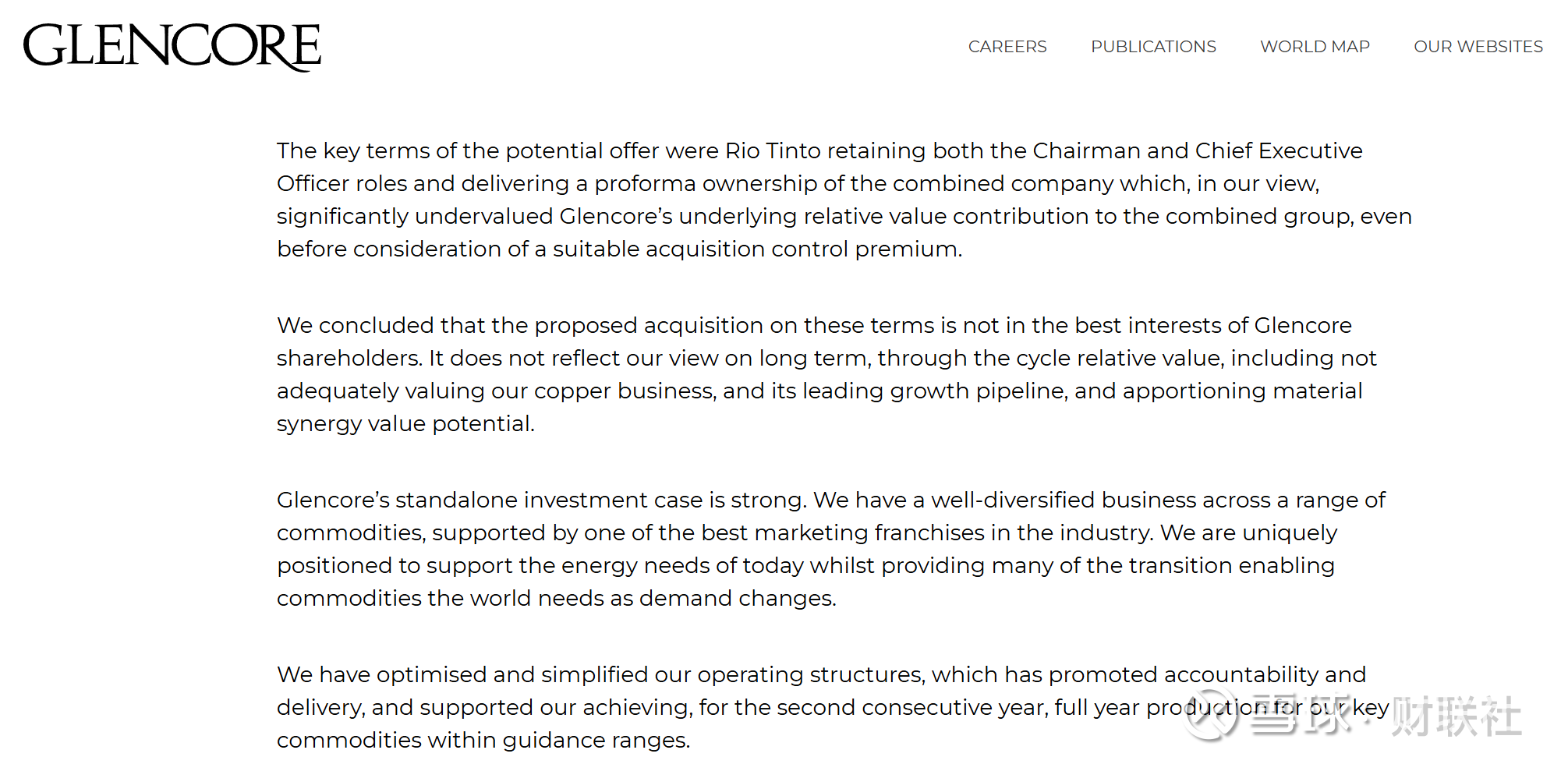 与力拓简单表示“无法达成能为股东创造价值的协议”不同,嘉能可详细描述称,在拟议的合并要约中,力拓要求其董事长和首席执行官继续担任新公司的对应领导位置,同时给予嘉能可的备考持股比例,严重低估嘉能可在合并集团中的相对内在价值贡献,而且连收购控制权的溢价都没给。