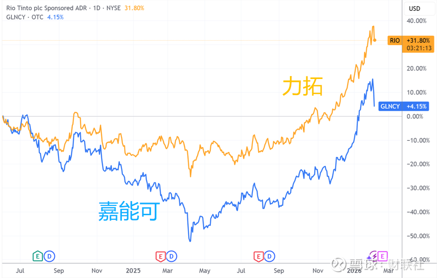 不过随着嘉能可去年宣布战略转型、全力加码铜矿业务后,今年以来的股价涨幅明显强于力拓。以1月发布公告前的最后一个交易日收盘价计算,力拓美股当时的市值为1368亿美元,到本周三市值达到1567亿美元。嘉能可也从661亿美元,期间最高涨至822亿美元。