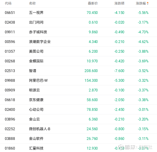 财联社2月6日讯(编辑 胡家荣)受海外科技股抛售情绪传导影响,港股AI概念股多数走弱。截至发稿,五一视界(06651.HK)跌5.56%、赤子城科技(09911.HK)跌4.73%、浪潮数字企业(00596.HK)跌4.62%、美图公司(01357.HK)跌3.88%、出门问问(02438.HK)跌3.17%。