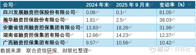 可以看到,应收代偿款增幅较大的机构有四川发展融资担保股份有限公司、瀚华融资担保股份有限公司、安徽省信用融资担保集团有限公司,2025年9月末数据较上年末增幅均超过30%,不过,其中四川发展融资担保股份有限公司应收代偿款规模较小。
