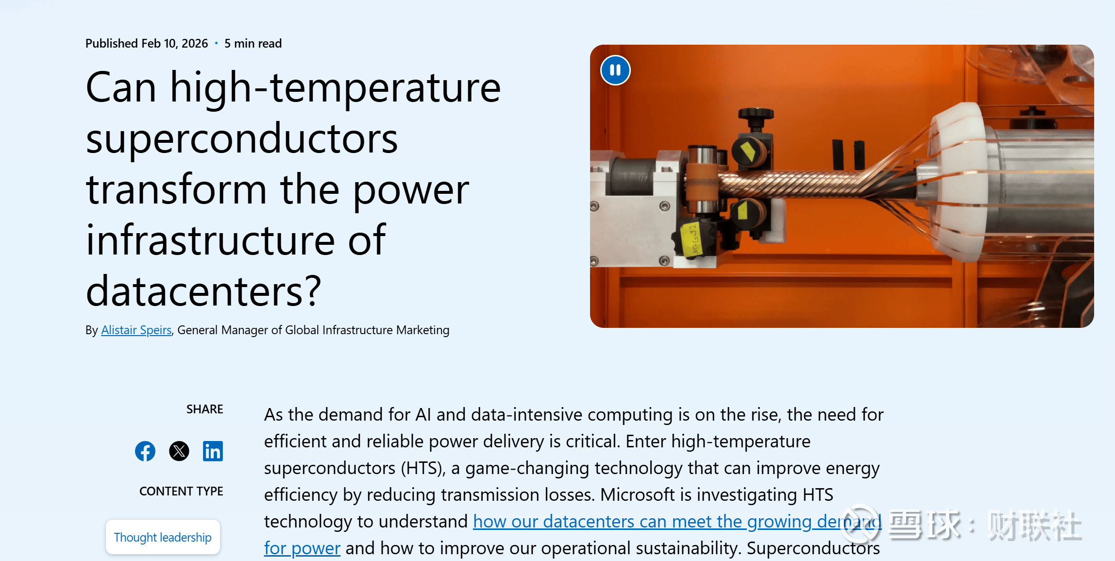 财联社2月11日讯(编辑 史正丞)全球云计算巨头微软在本周发布的一篇博客中表示,随着高温超导(HTS)电缆的经济性取得进步,公司正在探索使用这种材料重新设计数据中心的供电布局。