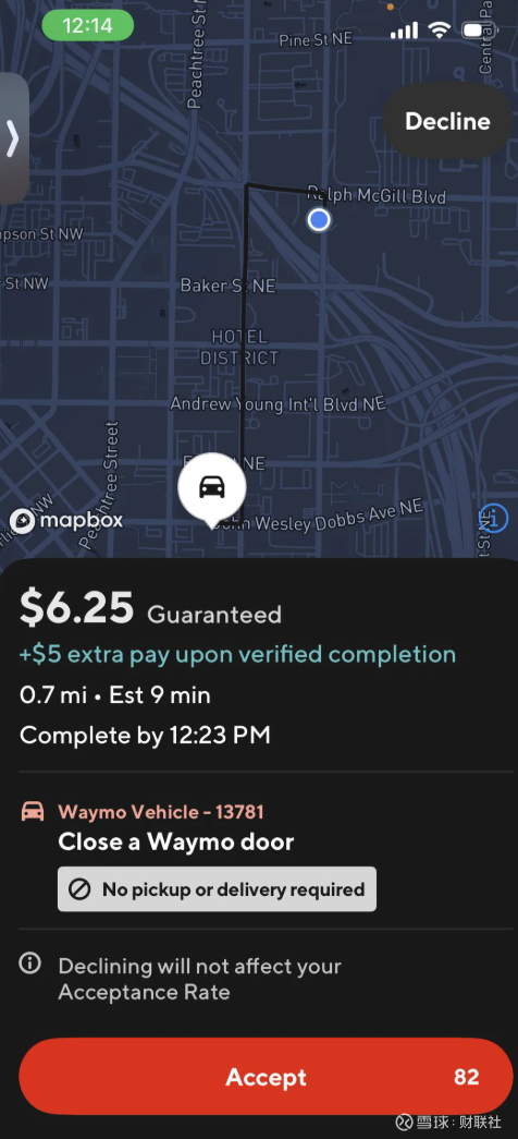 据一位亚特兰大网友发布的截图显示,他在外卖平台DoorDash上看到了一个奇怪的订单,开价6.25美元让他去一英里外找一辆Waymo汽车,随后把车门关上。在验证完成任务后,外卖员还将额外获得5美元。