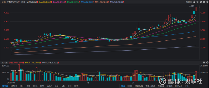 受半导体板块热潮与韩股活跃等因素提振,中韩半导体ETF节后一路高歌猛进,仅3个交易日便上涨19.9%,不仅跃过此前于今年1月末录得的阶段高点,同时于近期开始连日新高之旅。从量能数据上看,截至今日收盘,中韩半导体ETF全天成交额达86.99亿元,创2025年10月13日以来4个月新高,同时也是其上市以来的第三高历史峰值纪录。