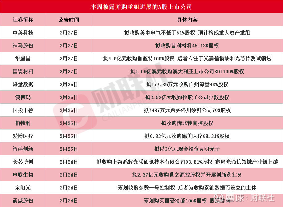 据财联社不完全统计,截至发稿,本周披露并购重组进展的A股上市公司共有14家,包括中英科技、神马股份、华盛昌、国瓷材料、海量数据、澳柯玛、国投中鲁、伯特利、爱博医疗、智洋创新、长芯博创、申联生物、东阳光、通威股份,具体情况如下图: